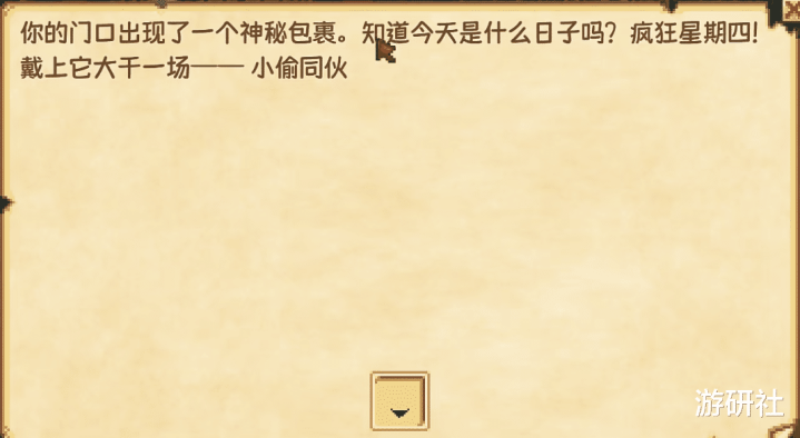这两个看似八竿子打不着的系统,现在你能同时在一个游戏里玩到了。在这个玩法模组中,每周四玩家都会收到一个蒙面面巾。戴上面巾之后,你就成为了“侠盗”,可以在营业时间段内潜入任意建筑物,来一场酣畅淋漓的“星露谷搜打撤”。